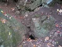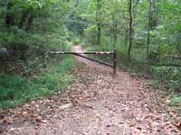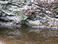 After walking the the first flat trail section, you come upon an incline. After getting up the hill, the path turns rocky and crosses a power line right of way. Shortly there is a fork. In this case, the upper fork is a shortcut and the right one leads down to the creek. We take the path down and walk along the water. There is a high rock wall where the stream has made some pools and small beaches. It's a good spot for a picture or two, maybe stop and soak the feet here on the return. We can't linger as there is a long way to go yet. We hike past large eastern hemlocks, rhododendron, sycamore trees and a wide range of Appalachian plant life.