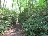 The trail runs mostly level through a green world of rosebay rhododendron. In this lush place they grow large. It's no wonder the pioneers called these dense patches hells. Imagine trying to walk through that without a trail. They bloom earlier in the summer with large slightly pink white flowers.